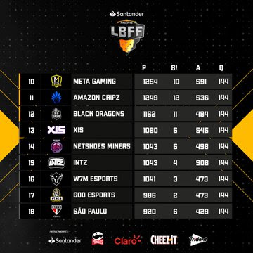 A décima segunda semana da Liga Brasileira de Free Fire chegou ao fim e deixou expectativas para o que vem por aí, com as equipes cada vez mais disputando posições altas na tabela. A Vivo Keyd Stars (VKS) abriu maior distância do Fluxo e se aproximou da Magic Squad, tentando recuperar o top 1 da competição. Os jogadores já tinham feito um Booyah! no domingo (2), mas foi na segunda (3) que o jogo virou de verdade quando eles conquistaram mais dois Booyah!s seguidos, sendo um deles com 15 abates. Além disso, a VKS foi a primeira equipe a atingir 1.000 abates nesta edição da Liga. Também teve bastante movimentação dos times mais abaixo na tabela: Amazon Cripz fez dois Booyah!s na segunda e uma performance bem consistente ao longo do dia. Black Dragons, Meta Gaming e SPFC também marcaram seus Booyah!s ao longo da semana. Mesmo sendo a lanterna da competição, o São Paulo tem se mostrado mais consistente e fez seu Booyah! depois de derrotar a LOUD, que não teve uma semana muito boa. O time não fez nenhum Booyah! e perdeu duas trocações importantes para o SPFC e para a Team Solid, no entanto, conseguiu manter sua posição na tabela. Corinthians e a paiN Gaming também se mantiveram na mesma colocação, mas tiveram uma boa performance ao longo das rodadas.